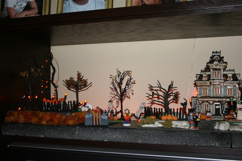 This is on top of our TV in the Rec room. The house is the Haunted House by Dept. 56. There is noise available by clicking the switch; the sounds are a squeaking door hinge, screams, thunder and lightening with lightening effects. Now I can enjoy it for a couple months before the Christmas decos go up.